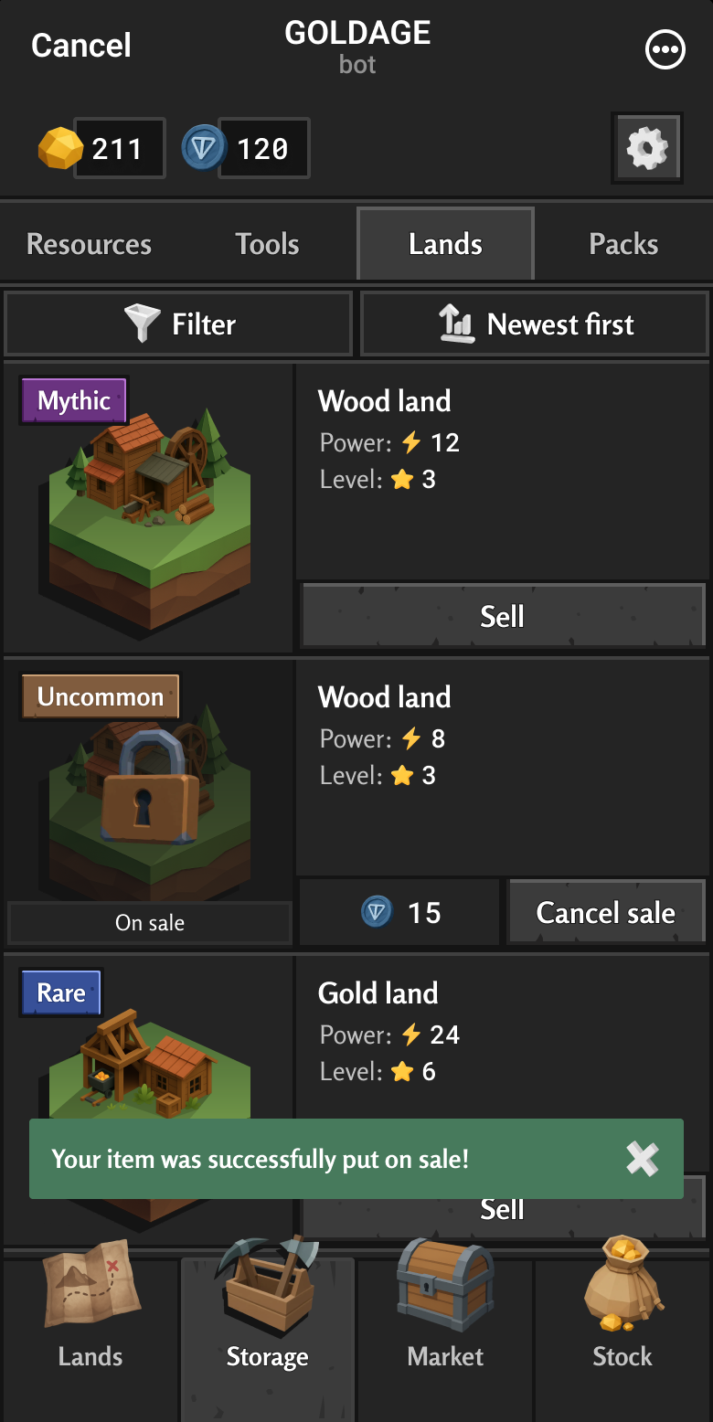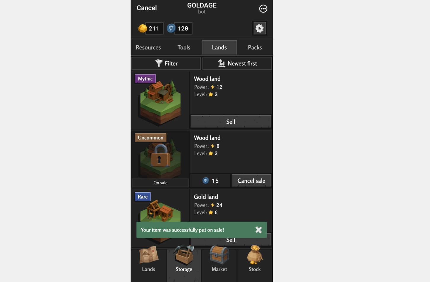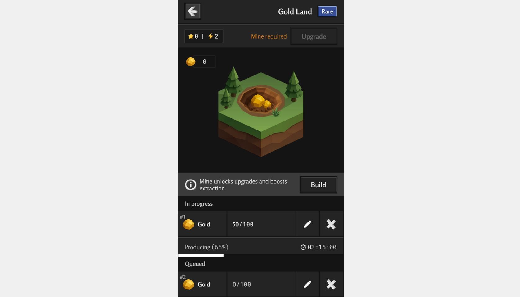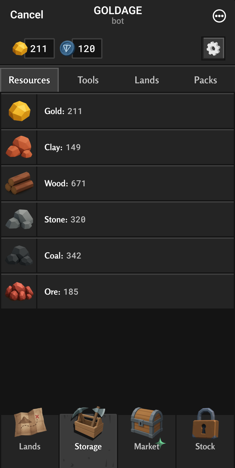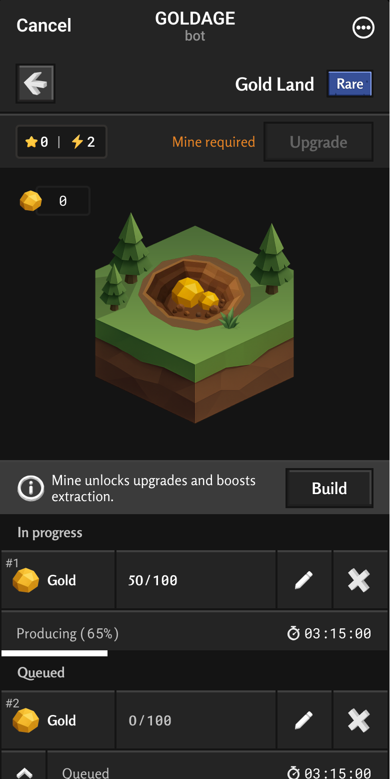 Gold Age is a user-driven economic strategy game built around land ownership, resource mining, tool usage, and player-to-player trading. Players acquire land, mine resources, upgrade infrastructure, and optimize production using consumable tools, while participating in a shared economy shaped by supply, demand, and player decisions.