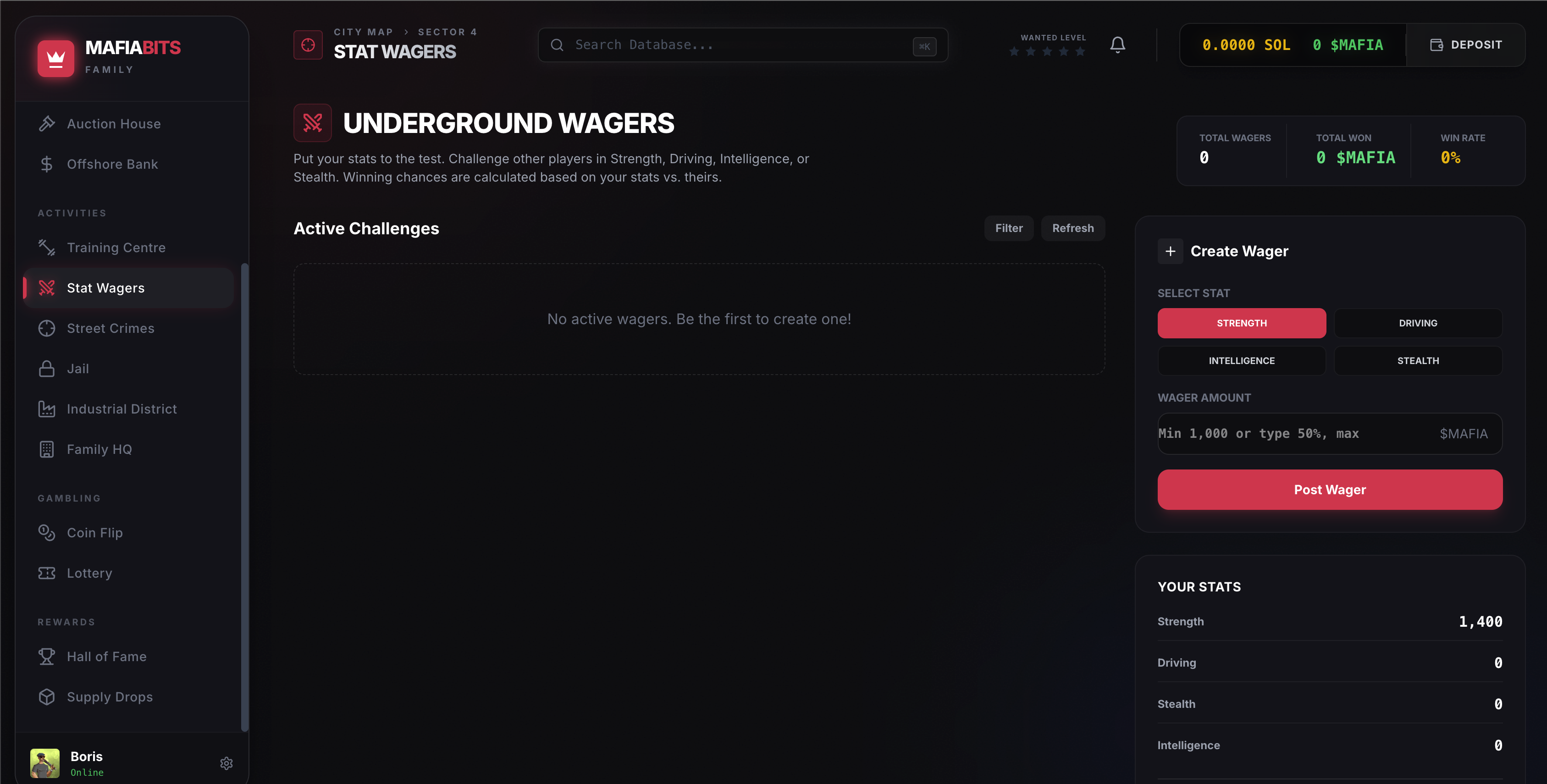 MafiaBits is a fully on-chain, text-based MMORPG on Solana that draws heavy inspiration from classic browser-based crime games of the 2000s. Players are dropped into Havenshore City, a sprawling map with 120 districts to fight over, where the core gameplay revolves around building criminal families, claiming turf, committing crimes, and battling rivals in PVP combat. Solana's fast block times keep every on-chain action snappy and responsive. The cooperative side shines through the family progression system, where players coordinate within their crews to hold and expand territory. The $MAFIA token powers the in-game economy, fueling everything from territory control to competitive PVP systems. With market volume crossing $4.2M and over 15,000 active players competing across all 120 territories since Season 1 launched in February 2026, this crypto game has built real traction fast.
