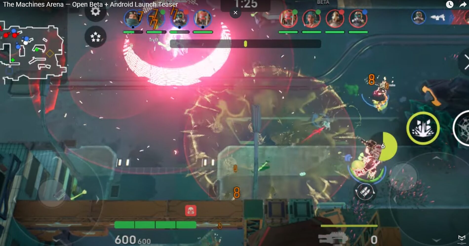 The Machines Arena is a quick-paced, action-packed, top down, MOBA game pitting two teams of four players against each other in a variety of game modes. Wielding weapons such as guns, lasers, and flamethrowers, players fight in matches that typically last 5-10 minutes. The Machines Arena offers ten characters to choose from, with an assortment of powers, strengths, and weaknesses. Characters are classed as tank, support, and assault. Working together with your team is crucial for success.