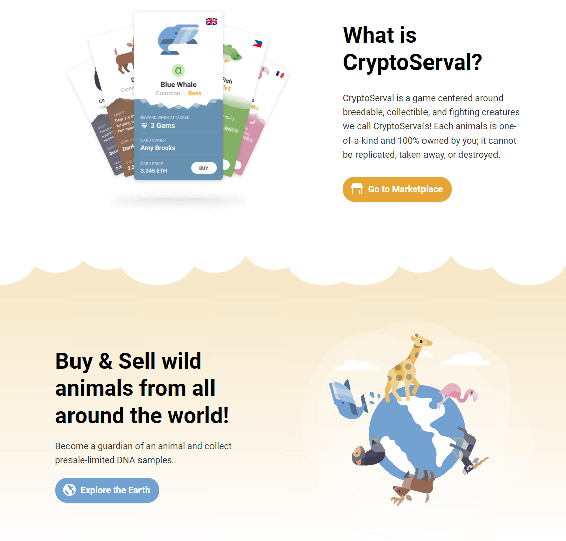 CryptoServal is a game centered around breedable, collectible, and fighting creatures we call CryptoServals! Each animal is one-of-a-kind and 100% owned by you; it cannot be replicated, taken away, or destroyed. Unlike in other hot potato games, each animal has a target price - when reached it becomes a boss and yields passive rewards for its owner.