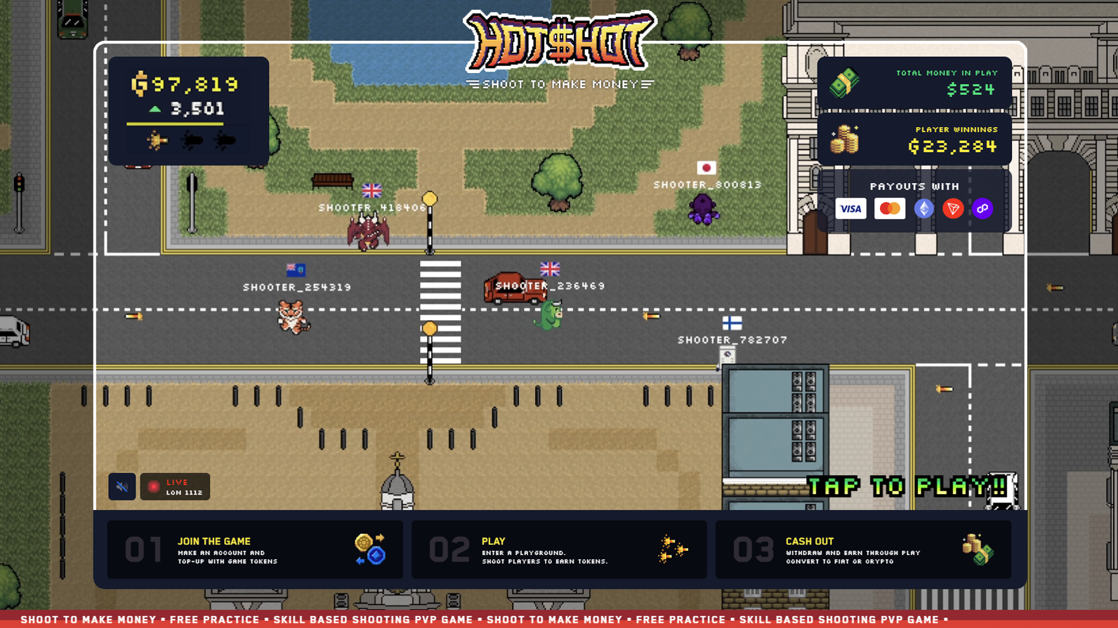 Hotshot isn’t just another multiplayer shooter - it’s the game where skill meets profit. Every hit you land is worth between ~$1–$5, instantly turning your reflexes into real rewards. Forget meaningless XP grinds - here, your sharpshooting abilities translate directly into earnings. Powered by the FTG (Fast Transactional Gaming) platform, Hotshot ensures seamless play whether you’re using crypto or card. With support for Ethereum, Base, Tron, Polygon, Optimism, and Arbitrum, you can withdraw in the same currency or card (VISA or Mastercard) you play with, making every match as financially rewarding as it is thrilling.