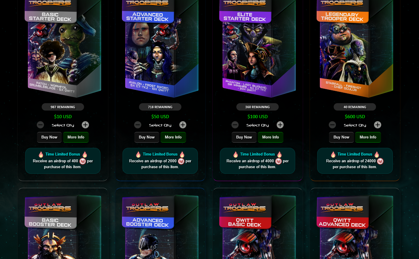 - $10 Package: Includes Trooper NFTs and an airdrop of 400 FGL tokens. Limited to 987 units.