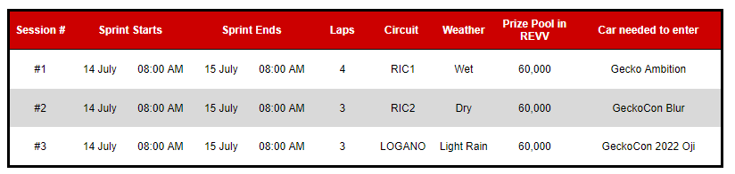 The 180k is split across 3 racing sections with each featuring a 60k $REVV reward pool. Each racing section requires a specific Gecko car, all of which are available on OpenSea. Every race is divided into two different pools each with their own leaderboard: one for drivers that use a shared link, and one for those racing on their own. How prizes are distributed across these two pools will depend on the total amount of sessions from both groups. For example, if 70% of sessions consists of players using a shared link and 30% coming from those driving on their own, then the rewards are distributed at a ratio of 70:30. In the Medium post for the tournament, the team states that in the event that "any driver prizes are below 5 REVV, it will be topped up to 5 REVV."