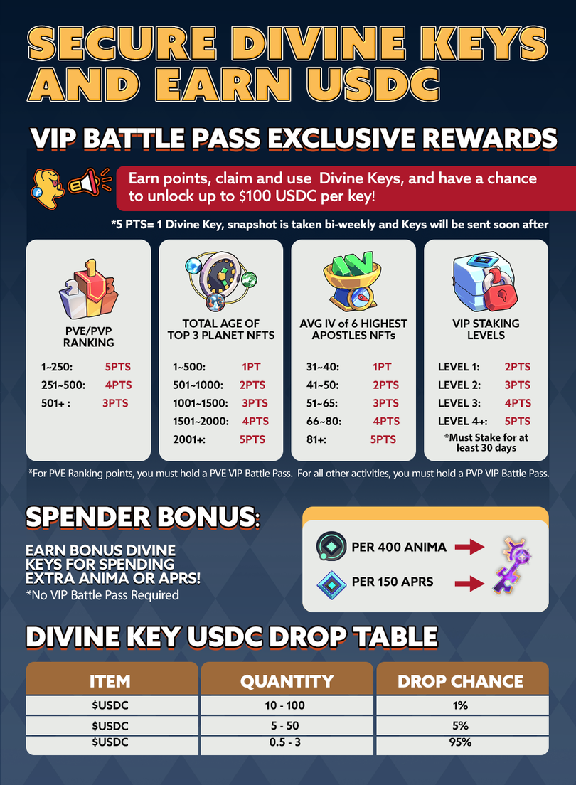 For every 5 points you earn, you get a Divine Key, through which you can earn more USDC, with tallies said to be taken every second week. When it comes to Divine Key USDC drop rates, there is a 1% chance of receiving $10 – $100 USDC, a 5% chance of earning $5 - $50 USDC, and a 95% of earning $0.5 - $3 USDC. You can earn more Divine Keys by spending APRS/ANIMA on breeding Planets, Chronomerging, minting Apostles, buying items from the VIP Shop (including the battle pass), and by charging up APRS and ANIMA into APRM and ANIMUS.