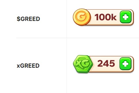 xGREED is a non-tradable currency used for upgrades and purchases. It can be converted to $GREED at a 1:1 ratio, with a five-day cooldown. This setup adds a strategic layer, as players must manage their xGREED and $GREED balances.