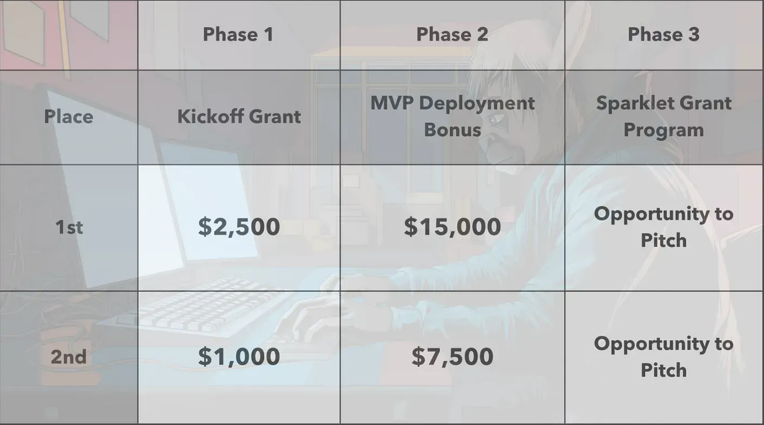 The event is structured into three phases, with cash prizes and grants up for grabs. In the first and second phases, the top two teams will receive cash prizes, with the first-placed team taking home $2,500 and $15,000, respectively. The second-placed teams will receive $1,000 and $7,500, accordingly.
