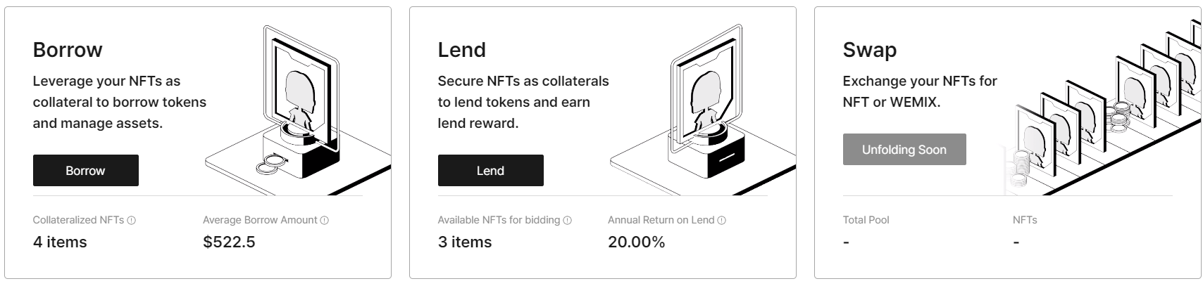 Per the official statement, NFTFi is now available on NILE (NFT Is Life Evolution), a Web3 platform built on WeMade's Wemix blockchain network. The service is split into 3 components: Leasing, Lending, and Swapping, allowing users to make the most of their digital assets. Holders can use their NFTs as collateral to borrow WEMIX or WEMIX Dollars or lend these tokens to others via an auction system. Once the Swap function goes live, they can exchange their NFTs for other crypto assets.