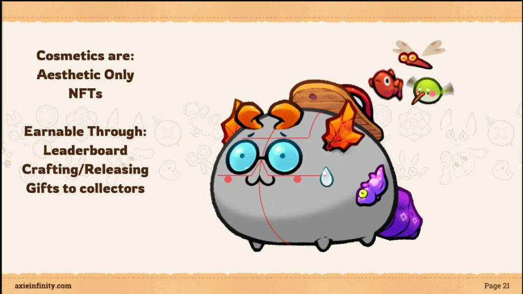 In addition, two new, upcoming features, Upgrading, and Accessories, will allow players to personalize their Axies. Upgrading lets players improve the Parts of their Axies. By upgrading a Part to level 2, not only does that Part become more powerful, but it gets a new visual look as well! Accessories are just cosmetic, but who doesn't want to give their Axie some cool shades!?