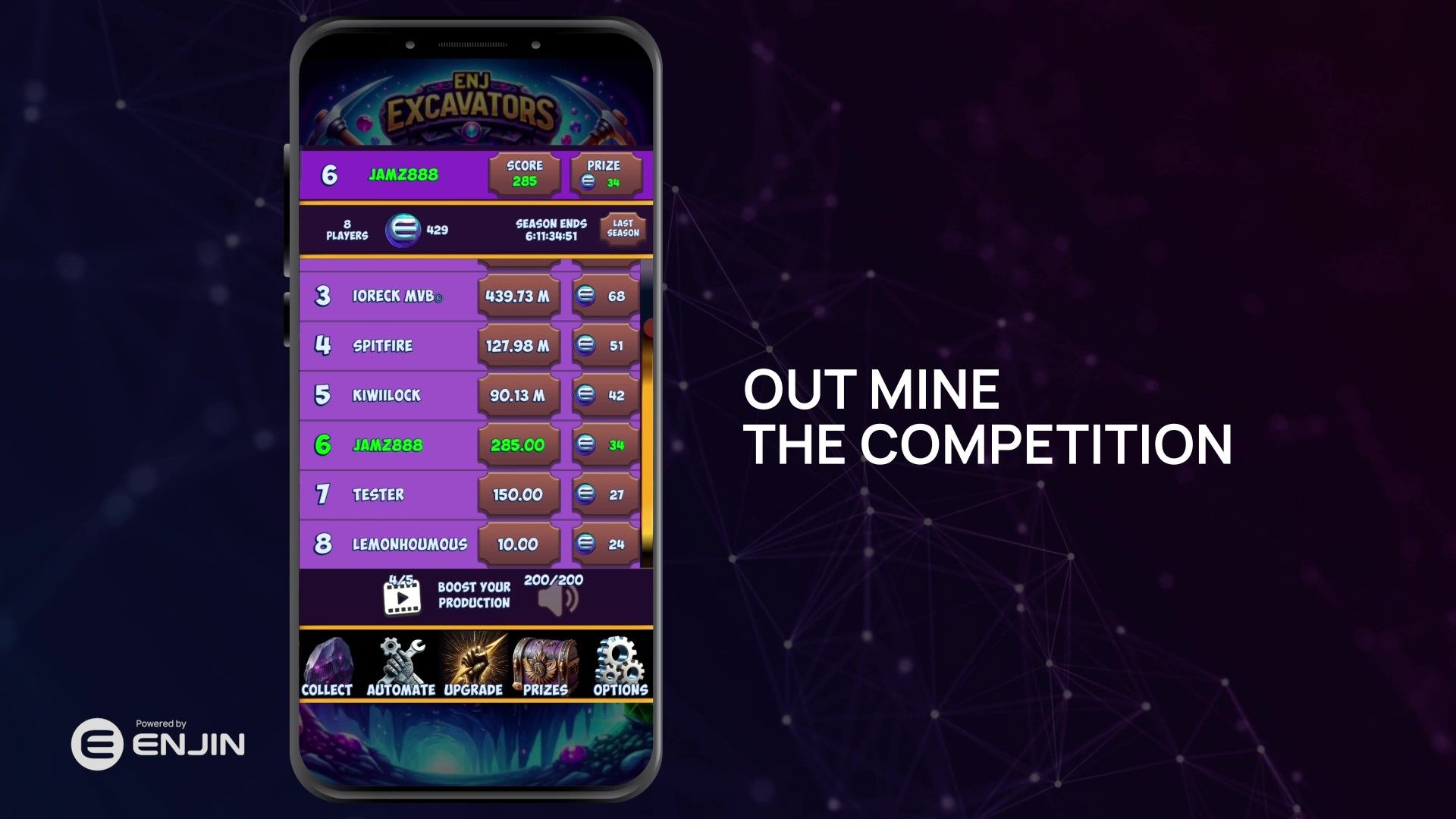 ENJ Excavators is a free to play hyper casual idle mining game on the Enjin Blockchain available for Android and Windows. In this title, players tap to mine Gems and develop a mining operation that functions both actively and in the background. Gems serve as the core resource used to upgrade equipment efficiency or hire workers and special goblin characters that automate the mining process. The game features a competitive global leaderboard that resets every Tuesday, rewarding players based on their Gem shares at the end of each weekly season. This includes a play-to-earn model where the game distributes Enjin Coin to participants, which can then be used to obtain NFTs like the Goblin Cart to permanently boost efficiency. Additionally, mining gems in this environment generates Essence for the active Multiverse season, allowing players to evolve an Elemental Blob from Common to Legendary status.