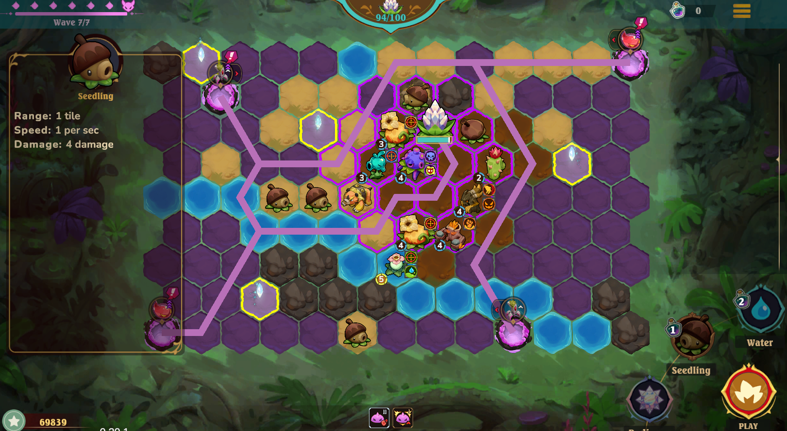 Everseed offers a bit more strategy than most tower defense games. The creeps don’t have set paths they follow. Instead, they take the shortest route they can to your base. Players have a semi-open choice about where to place their Plants (towers). Though some terrain comes with limitations. Players must also clear Blight to reveal tiles. resulting in several layers of strategic planning during the placement phase. This more open building concept allows players to create their own, customized gauntlet of doom for the creep waves!
